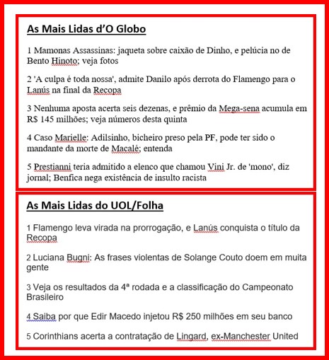 -…sem coragem de desafiar os poderosos, indiferente à realidade cruel de seus semelhantes. E não estou me referindo apenas ao povão politicamente analfabeto. Olhem só as matérias mais lidas num dia qualquer pelas classes mais escolarizadas do Brasil… Dá vontade de chorar!