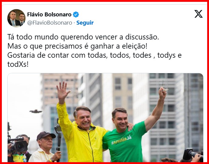 – Não demorou muito e, incapaz de trabalhar e governar, entregou o comando do país ao Centrão e foi curtir a vida de moto e jet ski. A história já começou a se repetir. Flávio não é radical, não é misógino, apoia os movimentos trans… Seremos nós, brasileiros, mais idiotas do que eu pensava?