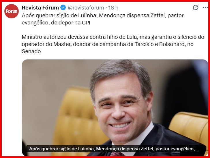 – Interessante, pois, a nova prisão do Vorcaro, autorizada pelo André Mendonça, justo quando figuras fascistas começam a aparecer na Mídia, suplantando os acusados preferenciais de sempre, Lula, petistas , ministros e parentes. E a denúncia, quem diria?, é da Malu Gaspar!