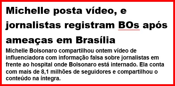 12 – Uma bolsonarista filmou jornalistas em frente ao hospital onde o ex-mitô está internado, que é um trabalho normal de repórteres sempre que algum figurão é hospitalizado. Mas o ódio é mais forte e ela insinuou, sem provas, que eles estavam torcendo pela morte dele.