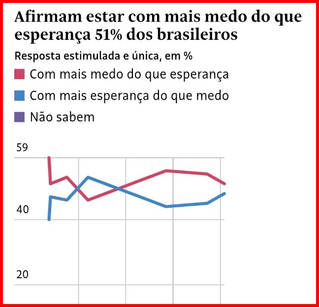 – A mais recente levantou a percepção dos brasileiros sobre a situação do país. Sem comparar com resultado de dezembro, os 03 gráficos publicados destacam que estamos inseguros, desanimados e com medo. Só que os gráficos indicam que a tristeza está em baixa e a esperança em alta…