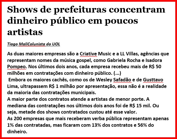– Não há mais coliseus hoje e sim estádios, mas não se come inimigos e cristãos neles. Os políticos, então, usam os parcos recursos municipais pra dar aos eleitores o circo, shows de música gospel ou sertaneja. Nada tenho contra os músicos, mas gostava mais quando não eram cabos eleitorais.