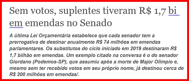 – Por isto mesmo, são eles os representantes do povo e para isto são eleitos por este povo. No caso dos senadores há um porém: há 16 deles hoje que são suplentes, ou seja, não receberam um mísero voto, mas distribuem emendas quando ocupam o cargo. Viva o Brasil!