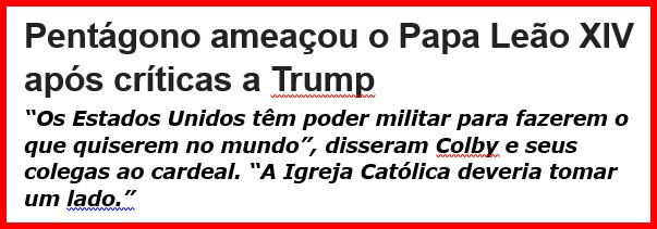 – Daí que um subchefe do Pentágono convocou o cardeal Pierre, embaixador do estado papal nos Estados Unidos para adverti-lo por uma crítica do Papa Leão XIV à militarização global, entendida como um ataque a Trump. O Vaticano que se cuide… depois de Irão e Cuba, pode ser o próimo…