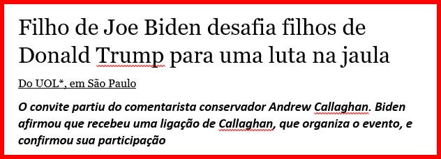 – Num país que elege um psicopata como presidente, com pretensões de ser ‘The King of the World’, promover uma luta de UFC entre seus filhos e o filho do ex-presidente, é o verdadeiro ‘american dream’. A ONU podia sugerir que a arrecadação fosse destinada ao Líbano e à Palestina…