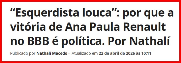 3 – É um fato inusitado, que vinha sendo ‘cantado’ nos bastidores do show business: uma quarentona de esquerda, jornalista independente, torpedeada pelos fanáticos pelo programa e xingada, injuriada e caluniada pelo bolsonarismo, foi a vencedora do BBB 26.