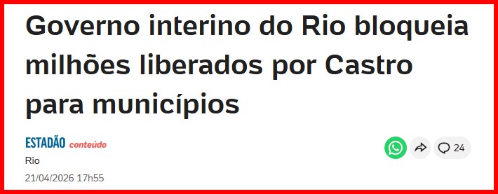 6 – Aumentando os riscos que corre, o governador em exercício do Rio deu outra canetada higienizadora na administração do Rio: acabou com outro sugadouro de recursos públicos do Estado, que já está devendo até os tapas-sexo das exuberantes mulatas que agitam o Sambódromo.