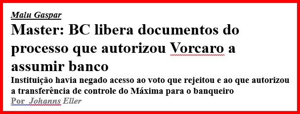 -…a presidência do BC neste mesmo mês, indicado pelo Paulo Guedes e, em outubro, a sua nova diretoria autorizou a compra do banco, que se tornou o Master. Mas é claro que o ex-ministro da Economia e o ex-presidente do Banco Central nada têm a ver com isto, né Malu Gaspar?