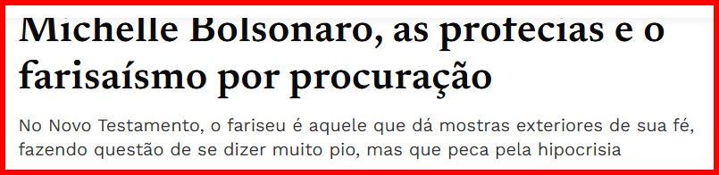 1 – Numa de suas pregações políticas pelo Brasil, a ‘madalênica’ Michelle citou Deus 29 vezes, fosse para indicar que na luta do BEM contra o MAL, seu marido era o escolhido de Dele, fosse para pedir-Lhe pela salvação do Brasil. A ex-1ª Dama era cotada para altos voos políticos… -…mas o ex-mitô cortou-lhe as asas. Ela recolheu-se à prisão domiciliar para cuidar do marido e preparar sua campanha à senatoria do DF numa chapa feminista (???) com Celina Leão e Bia Kicis. Com a certeza que Deus anunciará aos brasilienses que caminhar com ela os levará a Ele.