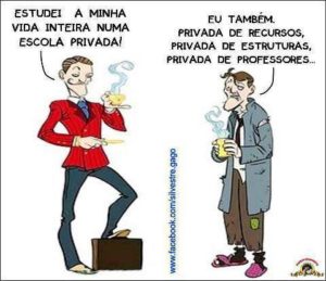Nós preferimos pagar por escolas primária e secundária particulares caras (e encher o peito de orgulho ao declarar: minha filha estuda no Galois!) em vez de brigar para que as escolas públicas sejam bem equipadas, paguem bem os professores e tenham professores capazes, pois é exatamente para isto que servem os impostos que nós pagamos… De outro lado, o que é extremamente contraditório, nos vangloriamos quando nossos filhos passam numa universidade pública (milha filha vai fazer Filosofia na UnB… óóóóhh!).