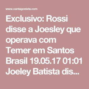 Joesley entrou no gabinete e, com seu goianês típico, não mediu palavras para admoestar Wagner Rossi sobre o amigo Temer, que lhe fora apresentado recentemente por ele. Segundo o dono da Friboi, ele já autorizara repassar 03 milhões para o candidato a vice da chapa PT/PMDB, “e o homem queria mais!” E arrematou que podia arrumar mais, mas queria a contrapartida do ministério.