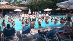 Nós fomos num dia da semana… E, ao contrário, estava cheio. Muitos velhos carecas, barrigudos, mas de calção ou bermuda, refestelados pelas espreguiçadeiras à beira da piscina, com garrafas de uísque, vodca, vinhos em portas gelos por perto, e muitas mulheres de saída de praia, deixando entrever peitos e b……* siliconados, de cabelos bem pretos ou com reflexos de louro, olhos e bocas pintadas, cocoteando como se tivessem sido misses em tempos passados, há muitos e muitos anos passados, aliás…