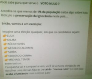Mas, certamente, continuaria na dúvida: em quem votar, então? Aí, receberia, via zap zap, um post informando que ele deveria votar NULO, porque se houvesse 50% de votos nulo + 1, a eleição seria anulada, nova eleição seria feita e quem se apresentou como candidato na eleição anulada não poderia se apresentar de novo…