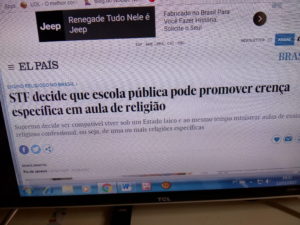 Nos meus tempos de grupo escolar, 60 anos atrás, o Brasil já era um Estado laico. Ou seja, não havia aula de Religião. O Estado laico existe no Brasil desde o Decreto nº 119-A, de 07/01/1890, de autoria de Ruy Barbosa (127 anos depois, o STF admite o ensino religioso nas escolas públicas… E tem gente que jura que o Brasil não está regredindo!!!).
