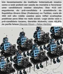 Se assim acontece nos procedimentos individuais, imaginem como é fundamental para os interesses globalizados de grupos, corporações, partidos, ideologias a difusão massiva de notícias falsas! Aquilo que eles fizeram durante muitos anos, via publicidade, facilidades comerciais, acesso ao poder, comprando o apoio nunca declarado dos meios de comunicação (sempre tão ciosos de sua “isenção”), eles continuam fazendo, claro, mas dispõem, agora, de outra arma eficientíssima, empresas especializadas em difundir notícias falsas através de robôs internéticos, usando, inclusive, poderosas plataformas como Facebook e Google.