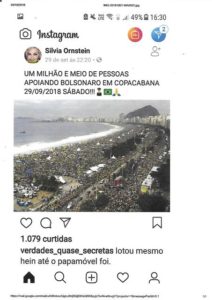 - os vários grupos de que eu participo aqui no Lago Oeste, alguns apolíticos inclusive, foram inundados por esta foto, com a mensagem: “UM MILHÃO E MEIO DE PESSOAS APOIANDO BOLSONARO EM COPACABANA 29/09/2018 – SÁBADO”. Esta foto, na verdade, é de uma visita do Papa ao Rio de Janeiro. Um bom computador com boa nitidez de zoom na imagem vai perceber que aquele furgão branco à frente do desfile é o Papmóvel… Não é o Bolsonaro nem o General Mourão acenando para a multidão!