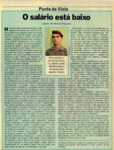 Quer coisa mais brasileira que o próprio futuro presidente do Brasil? Que, em reportagem da Veja de 25/10/1987, mostrando que ele e outro militar, Fábio Passos, tinham um plano de explodir bombas em unidades militares do Rio para pressionar o comando (a melhorar o soldo), declarou que ‘Nosso Exército é uma vergonha nacional, e o ministro (general Leônidas Pires Gonçalves) está se saindo como um segundo Pinochet’? E que está assumindo o governo brasileiro dia 1° de janeiro cercado de generais, que terão de lhe prestar continência, apesar de sua patente de capitão reformado?