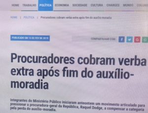 Ou como os patriotas combatentes da corrupção brasileira, nossos bravos procuradores gerais, que estão se movimentando politicamente para receber uma compensação financeira pela perda do auxílio moradia que recebiam: além do aumento de 16,38% nas suas remunerações (enquanto o salário mínimo teve aumento de 4,61%), eles estão batalhando por 60 dias de férias mais 16 de recesso mais o direito de trabalhar em casa 10 dias por mês mais o pagamento de gratificação por acúmulo de função.