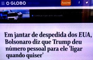 - Já o presidente, acompanhado de um dos filhos em estado de pura excitação (ria o tempo todo!), foi recebido pelo presidente Trump e foi o que sempre foi e continua sendo: tosco e ridículo! O dignitário da ainda 8º economia do mundo faz uma visita oficial ao dignitário da mais poderosa nação do planeta e a primeira tuitada que ele manda para seus seguidores é para dizer que recebeu o número do celular pessoal de Trump?