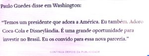 - em outro evento, organizado pela Câmara de Comércio dos Estados Unidos, o Posto Ipiranga bolsonarista foi enfático: “O Brasil ama os EUA e eu também” (ele foi mais amoroso ainda: disse que adorava Coca Cola e a Disneylândia…!), uma boa justificativa, ao que parece para eles, para o presidente entregar as riquezas do país com gosto e sem remorso, e fazer, sem contrapartidas, um monte de concessões aos americanos. Neste aspecto, Paulo Guedes foi direto ao que interessa: “Em três ou quatro meses estaremos vendendo petróleo, o pré-sal… Nós estamos de portas abertas para esses negócios”. Eu, particularmente, acho que ele deveria ter sido mais explícito, dizendo que o Brasil estava de pernas abertas para receber o amor ianque!