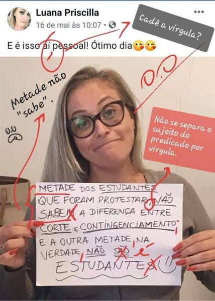 – Não basta usar óculos para parecer inteligente… Cometer tantos erros de português num bilhetinho nas redes sociais é ser um idiota inútil. Que não foi às ruas protestar contra os cortes na Educação. Certamente, nem sabe o que é Educação!