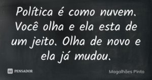 Ao longo de 50 anos, eu aprendi algumas coisas infalíveis na política, uma delas que uma frase atribuída a Magalhães Pinto, banqueiro e ex-governador de Minas, um dos grandes líderes civis da ditadura, é totalmente ignorada pela esquerda, que, parece, não consegue alcançar seu significado, talvez porque quem a disse foi um banqueiro de direita. A frase é esta: “Política é como nuvem. Você olha, está de um jeito. Olha de novo e já mudou.”