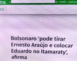 – A insignificância do Chanceler brasileiro foi deixada bem clara justo por quem o colocou no Itamaraty: “Se meu filho não for confirmado pelo Senado, eu tiro o Ernesto e boto o Eduardo como ministro! Alguém vai tirar?” É a mosca no cocô do cavalo do bandido!