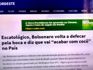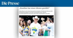 – Nem a terra natal de Hitler (ou talvez por isto), aguentou: o jornal mais antigo da Áustria, Die Presse, foi na jugular e tascou na manchete: “O Brasil elegeu um idiota” . No texto, diz que Bolsonaro não se contém, é um mentiroso, espalhando teorias da conspiração!