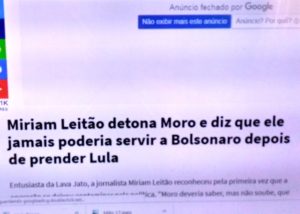 – A esquerda cai de pau sobre Miriam Leitão, que desancou Moro e a Lava Jato em sua coluna. Ela sofreu horrores na ditadura, mas anos de Globo lhe ensinaram a ficar do lado certo na hora certa. Moro e Lava Jato são cartas fora do baralho. Plim Plim!