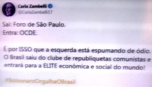 – Há dias, Carla Zambelli, a fanática deputada bolsonária, vibrava nas redes com as falas de seu ídolo sobre as promessas do líder maior, Trump, relativa à entrada do Brasil na OCDE. Fu…-se!* Quando ela vai perceber que o Mito só entende de fake news!