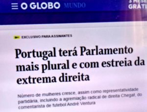 – A ‘geringonça’, apelido da coligação de esquerda que já governa Portugal, aumentou o n° de cadeiras no parlamento. Mas a grande imprensa dá destaque à extrema direita que, pela 1ª vez, elegeu deputado na terrinha: 01! Eu repito: 01 de 230 deputados!