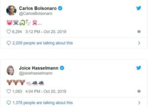 – O amor é lindo! Principalmente entre próceres (ou ex) do governo atual. Carluxo postou emojis de porco, rato, cobra, galinha e lula em sua conta no Twitter. E Joice Hasselmann postou três veados e três ratos em resposta. Edir a postos…