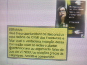 – Bia Kicis postou vídeo sobre intenção da CPI das Fake News de afastar o Mito sob “argumento falso de que ele VENDEU as eleições graças às fake news”. O ato falho está certo: ele VENDEU as eleições e o pagamento ia ser feito hoje com o leilão do pré-sal! Que fracassou!