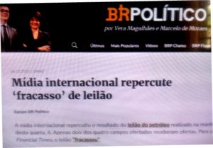 – Enquanto isto, The New York Times: “Governo do Brasil tinha grandes esperanças com seu grande leilão de petróleo. Elas vieram abaixo”, Wall Street Journal: “Brasil deu uma festa de petróleo, poucos se deram ao trabalho de aparecer”, Bloomberg:“Leilão é um ‘desastre total’”