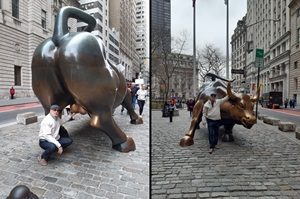 A vida não estava tão pulsante quanto eu gostaria. O medo da doença já estava atingindo todo mundo, mesmo turistas ávidos de levar recordações inesquecíveis para casa. Há uma tradição relativa à escultura do touro negro em frente à Bolsa de Valores em Wall Street: quem passar a mão nas bolas do touro ficará rico. Quando chegamos lá, havia dezenas de turistas, muitos brasileiros, fotografando, conversando, brincando com a tradição… Eu fui coçar o saco do touro e uma turista brasileira gritou: ‘Você é louco? Todo mundo passa a mão aí!’ Eu estava de luvas, aproveitei e segurei os chifres também… Quem sabe a riqueza viria em dobro!