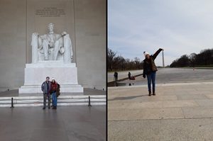 O passeio pelo Mall, que eu conhecera da primeira vez que estive aqui, foi uma lição de vitalidade dos netos, três jovens a correr pelos espaços quase desertos, a mostrar prédios e pular barreiras, a me ensinar algumas curiosidades, como a diferença de cores no “pirulito”, o Monumento a Washington, coisa que só percebi quando estávamos embaixo dele (ele começou a ser construído antes da II Guerra, foi interrompido a certa altura por causa da guerra e, quando retomada a construção, não existia mais o material usado até então).
