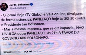 – Enquanto ‘seu amor’ reúne o staff de combate ao coronavírus e anuncia, nacionalmente, situação e medidas emergenciais pros Estados Unidos, o Mito fica no twitter xingando a Rede Globo porque divulga um panelaço contra ele e não divulga um panelaço a seu favor (panelaço a favor?????)