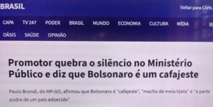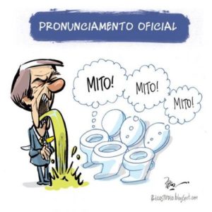 – O Mito diz que “brasileiro tem que ser estudado. O cara não pega nada. Eu vi um cara ali pulando no esgoto, sai, mergulha… Tá certo?! E não acontece nada com ele”. Concordo com o imbecil: ele é u a própria bosta, sempre falando merda, e os brasileiros o elegeram presidente!