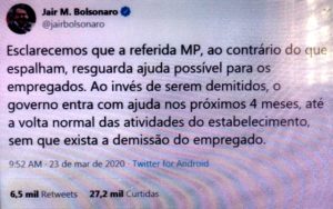 – Pra completar, disse que a esquerda usa o coronavírus pra transformar o Brasil numa Venezuela. O povão ia gostar. O governo de lá avisou que bancará os salários de pequenas e médias empresas e suprimirá pagamentos de aluguel e compromissos de crédito por 06 mese…