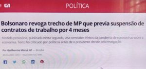 – As críticas chovem, ele defende a MP como fundamental para preservar empregos mas, antes do meio dia, revoga o artigo que permitia às empresas não pagarem salários por 04 meses. E vai soltar outra MP permitindo reduzir jornada de trabalho e salários até a metade. Foi bode na sala?