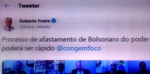 – E o Mito encerra a reunião dizendo que se a facada não o derrubou, não vai ser uma ‘gripezinha’ que vai fazê-lo. Se não for afastado imediatamente, o Brasil poderá ser dizimado pelo coronavírus. Seus fanáticos seguidores, imitando-o, certamente serão…