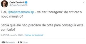 – Por falar nisto, a deputada Carla Zambelli foi criticar as cotas baseada no currículo do Decotelli e comeu cru! Apagou correndo, mas não adiantou: as redes não apagam!