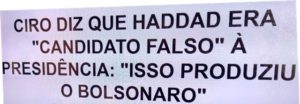 – Ciro Gomes continua sua batalha inglória pelo estrelato solitário. Diz que Haddad era um candidato falso e isto resultou no bolsonarismo. Deve ser uma angústia imensa prum egocêntrico como ele saber que um “candidato falso” teve mais votos que ele na eleição!