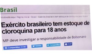 – Pois é! O Hospital Einstein proibiu o uso de cloroquina para tratar a covid19. Mais um contratempo para o ministério do Exército que, a mando do Mito, produziu milhões de comprimidos do remédio e está com um estoque para 18 anos. Quem paga a conta?