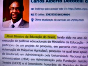 – Decotelli conseguiu 02 proezas em 01 semana: tirou o codinome do Teich, tornando-se Decotelli, o Breve, e descobriu uma nova doença, a curriculite, quando uma pessoa não pode ver um título e se apossa dele. Sem tomar posse, ele já incluíra ministro em seu currículo!