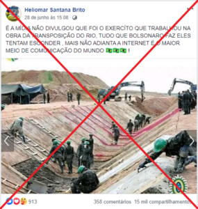 – Correndo nas redes uma foto de militares trabalhando num canal de transposição do rio São Francisco, com elogios ao Mito pela obra em si e pelo engajamento das Forças Armadas. Só que a foto é de 2014 e a obra fotografada é de 2012, governo Dilma. Vão apagar?