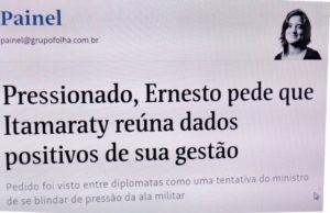 – Funcionários do Itamaraty estão de lupa na mão, escarafunchando arquivos e lixos. É que o ministro Ernesto Araújo, pressionado, quer levantar todas as suas realizações no ministério. Até agora, acharam aranhas, baratas e um livro de discursos do Trump.