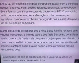 – Durante anos os bem nascidos, secundados pela grande imprensa, desceram o cacete no Bolsa Família – um programa que “estimulava a vagabundagem dos brasileiros e enchia o PT de votos”, apesar do programa ter sido considerado um exemplo pela UNESCO.