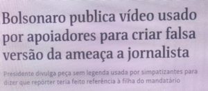 – O imbrochável tem momentos de bundão, como diz o Datena. Depois de ameaçar dar um soco na boca de um repórter, que perguntou sobre os cheques do Queiróz na conta da 1ª Dama, o Mito postou uma versão fake do fato. Cagaço ou acostumou-se à mentira?