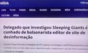 – O delegado da PF designado pra investigar o site Sleeping Giants, que acompanha e denuncia sites que divulgam ódio, fake news e desinformação, é cunhado do editor do site bolsonarista Senso Incomum, que costuma divulgar exatamente ódio, fake news e desinformação…